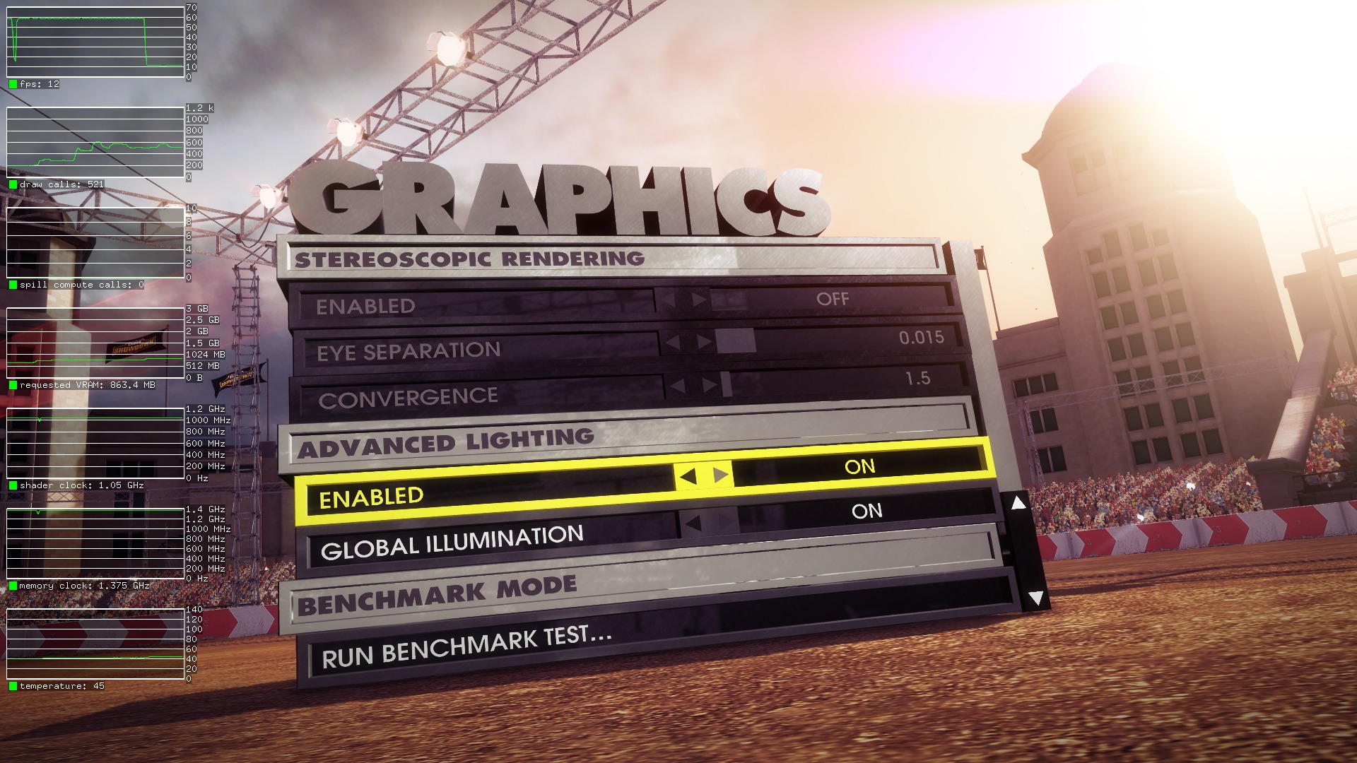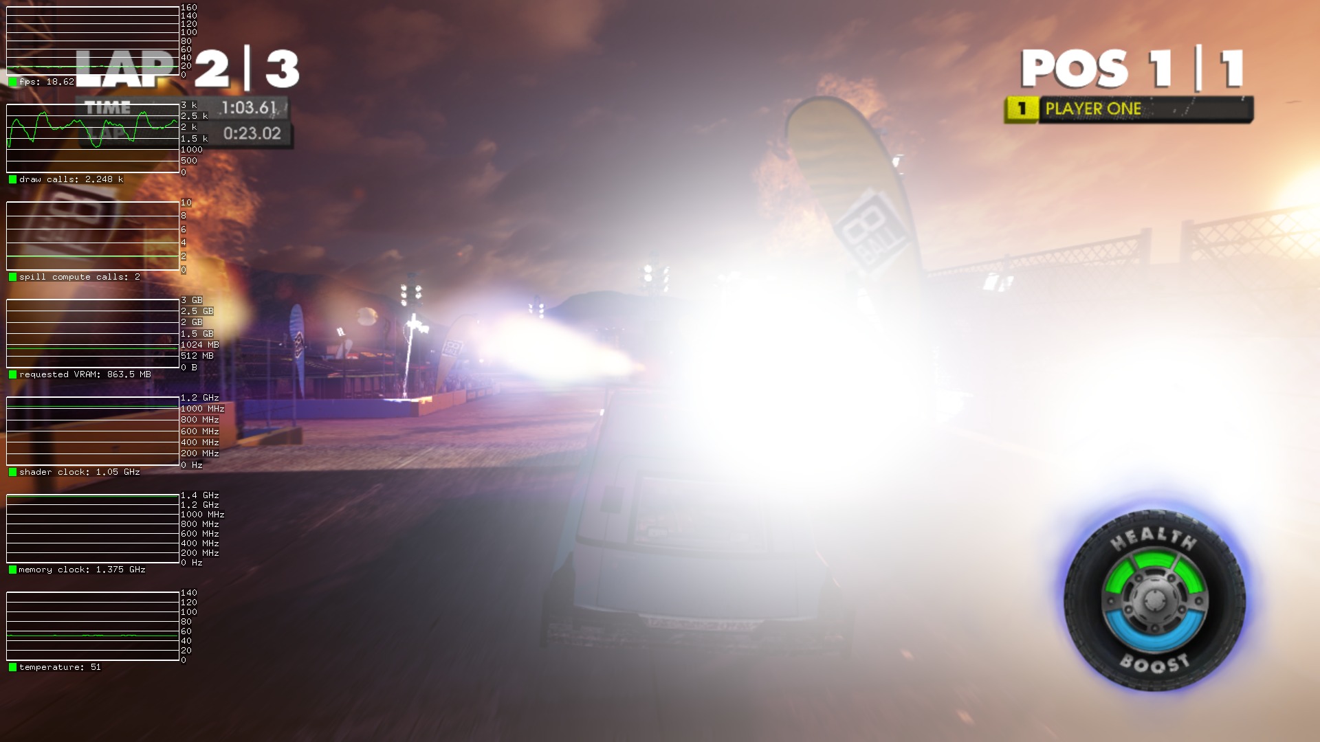 Created attachment 138979 [details] ingame benchmark mode The cars with texture errors seem to be either a game bug or Phoronix Test Suite bug. If you select the Benchmark mode while you in the actual game, the cars are rendered correctly. However the graphics are still broken. Seems to be a problem how the lights got applied to the objects.