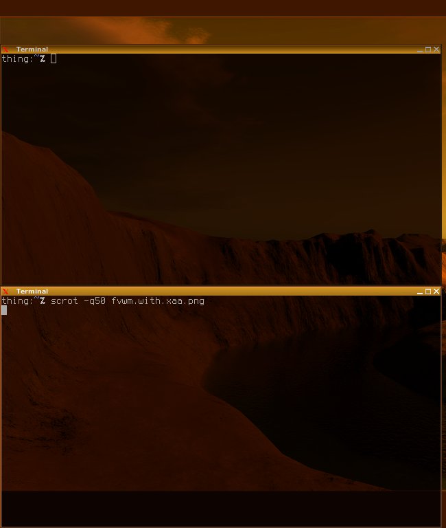 fvwm 2.5.21-1 xorg-server 1.2.0-1 xorg-xf86-video-ati 6.6.3-1 Relevant line from the fvwm configuration: Colorset 5 VGradient 20 #cf921f #a16f1a NoShape uname -rps Linux 2.6.20 athlon-4 lspci | grep ATI 02:00.0 VGA compatible controller: ATI Technologies Inc Radeon RV250 If [Radeon 9000] (rev 01) DESCRIPTION: With EXA acceleration enabled the gradients in the colorset above no longer work. See attached screenshots. Enabling/Disabling "AccelDFS" doesn't change anything. Worked before upgrade to xorg 7.2: YES. Anything else changed at the time: NOTHING WORKAROUND: Existing workaround; USE XAA