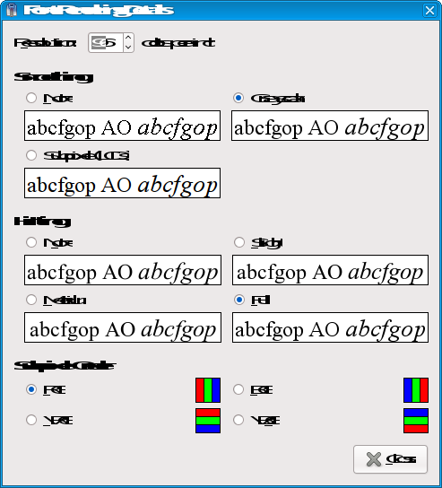 Created attachment 22299 [details] Screenshot showing error from latest patch Nicolaus, here's a screenshot showing the problem I'm getting. When grayscale or no smoothing is used, all the font metrics seem to be scaled horizontally. Also, it seems that even when disabling antialiasing, it still ends up using grayscale smoothing.