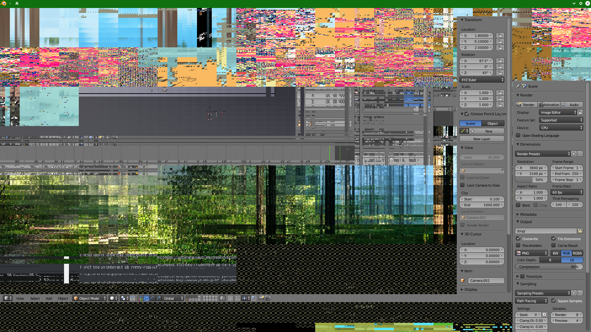 Created attachment 138438 [details] Screenshot of the Blender window glitching I should add another detail to the discussion. I know this may be a separate issue which might have nothing to do with the crash, but at the same time I wouldn't be surprised if it does: Glitched graphics often indicate something going wrong with the display, such as corrupt textures in video memory, which may ultimately lead to just such a lockup. On occasion, certain programs (namely Firefox and Blender) glitch out and draw broken rectangles all over the window. Some of those glitches are just boxes of random colors, others contain pieces of past images (for instance I saw patterns from my lock screen background). Sometimes they quickly disappear on their own, at other times I have to restart the program as it becomes illegible and unusable. If I move anything the squares flicker all over the place. The glitches continue even after I disable desktop effects, thus KDE compositing should have nothing to do with it. Attached is a screenshot of the glitch happening in Blender, showing its window covered in the corrupt squares. I'm curious what your opinion is. Again I know this may be an unrelated issue, but I'm wondering whether it indicates some video storage corruption that's also leading up to the lockups.
