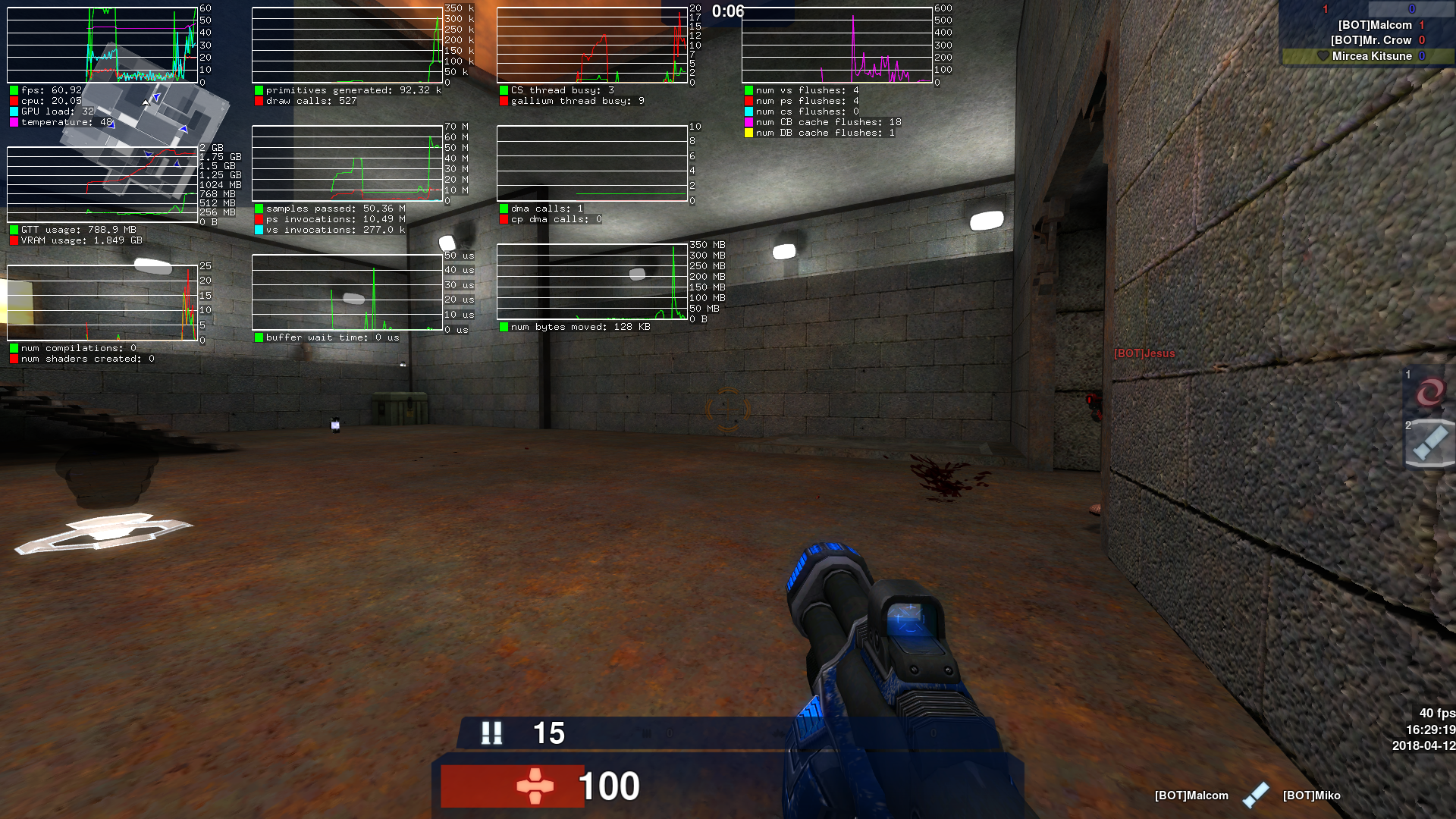 I just finished running the GALLIUM_HUD test, and will be taking a look at the other options next. It was more difficult to test now since the freeze occurs almost instantly after Xonotic loads the map (only a few seconds). I managed to make two photos which I'll attach below: One is the last screenshot I managed to take within the system a few seconds before it froze. The other is a photo of my screen after the freeze has taken place, obviously taken with my phone camera as the computer itself was bricked. A footnote I will add, even if I don't know whether people will even believe me: I had to take those screenshots several times because they kept getting deleted. Whenever I booted the machine back, every screenshot of Xonotic with this HUD was corrupted and turned into a 0 byte file... even ones that were quickly moved to other directories precisely to avoid this, and were also taken by an external process! Other files on my drive are fine, it's only those screenshots... thankfully one survived and it shows all of the graphs and parameters right before the crash. I'm legitimately crept out, as I didn't expect a potential attack program to contain software capable of identifying and deleting evidence of testing, which is the only explanation I can find for what I just saw. I'll do the next tests carefully as I don't know what else may happen to my computer.