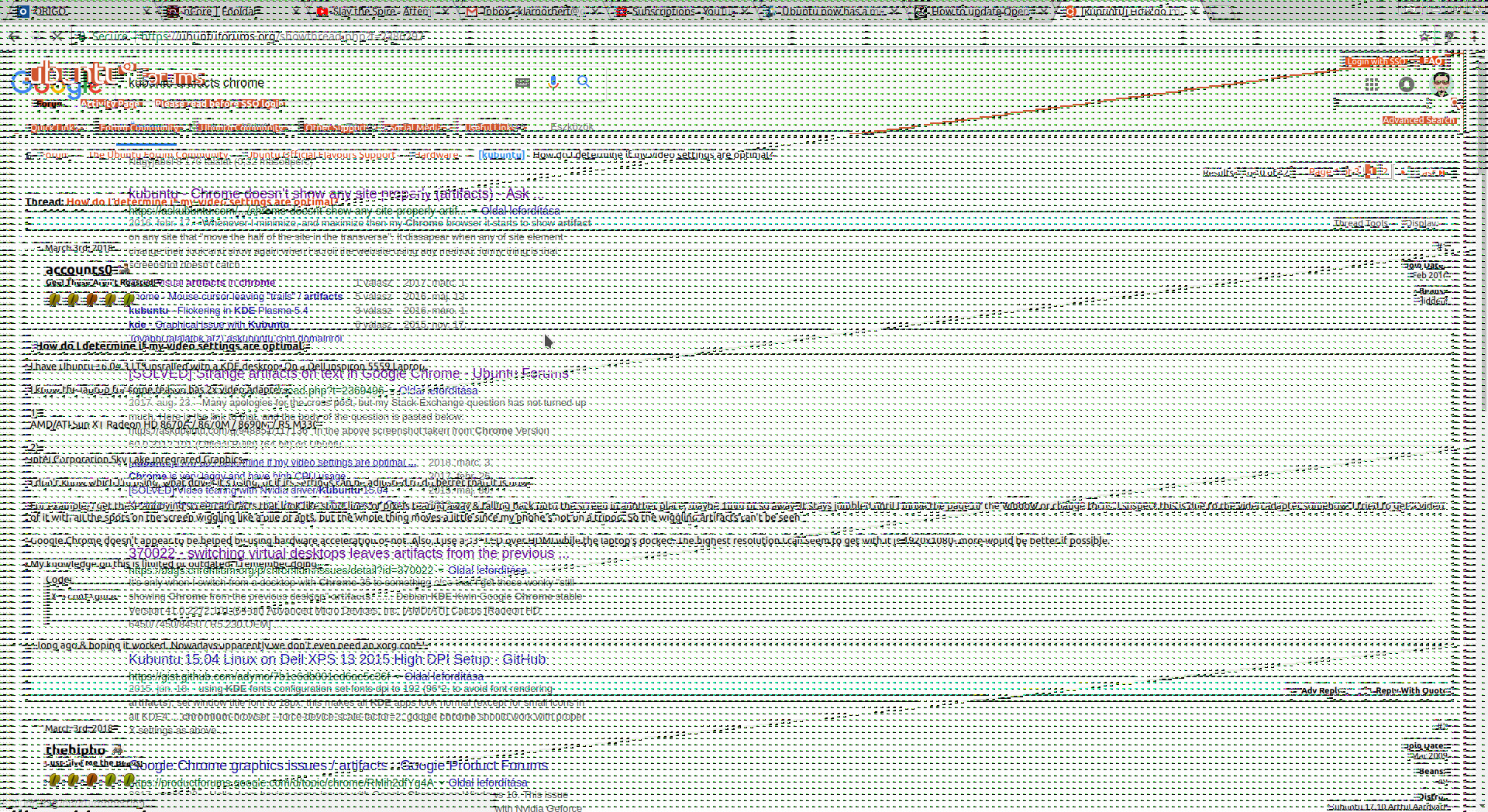 Created attachment 139276 [details] screenshot OS: Kubuntu 18.04.0 LTS 64bit VGA: MSI RX 480 8GB Mesa: Mesa 18.2.0-devel Getting these strange artifacts(see attachment), when using Chromium with hardware acceleration enabled(tried with three different version of the browser). After changing tabs in the browser, artifacts disappear, but come back after some time.