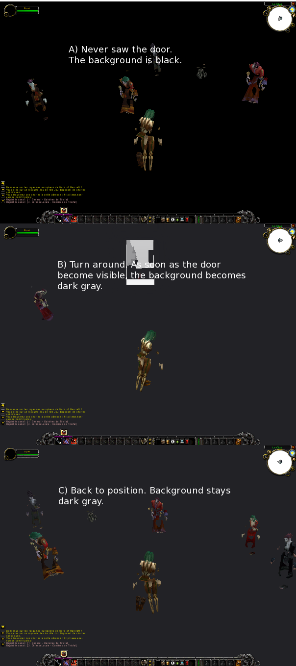 Created attachment 14260 [details] Fade@EEE : Bug not occuring until the door come to view. While loading NPC are textured but quick become white. WoW donesn't hang until I move the POV to see the open door (I can't see it, program hang just before).