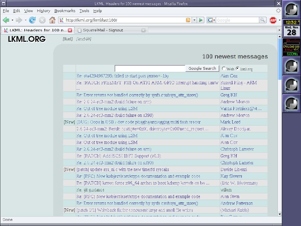 Created attachment 12809 [details] X after "fixing" with s2disk This is how the Window Maker screen looks like after "fixing" the previous corrupted state by doing a s2disk from console. The state shown in this picture is perfect and everything works fine. To stress, this picture was taken after seeing the corrupted state of the previous attachment. And to fix it all I did was to go (from that corrupted wmaker) back to the console, 'echo disk > /sys/power/state', resume, switch back to Window Maker (and take this photo).