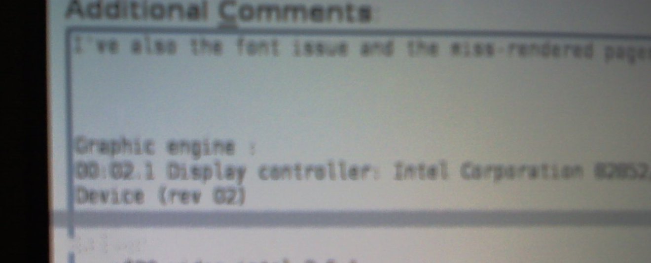 I've also the font issue and the miss-rendered pages on Firefox. It's pretty hard to send you a screenshot of the firefox issue, because when I hit the printscreen button, the page is refreshed and looks ok. I'll try to take a picture. Graphic engine : 00:02.1 Display controller: Intel Corporation 82852/855GM Integrated Graphics Device (rev 02) Driver : - xf86-video-intel-2.5.1 - libdrm-2.4.1