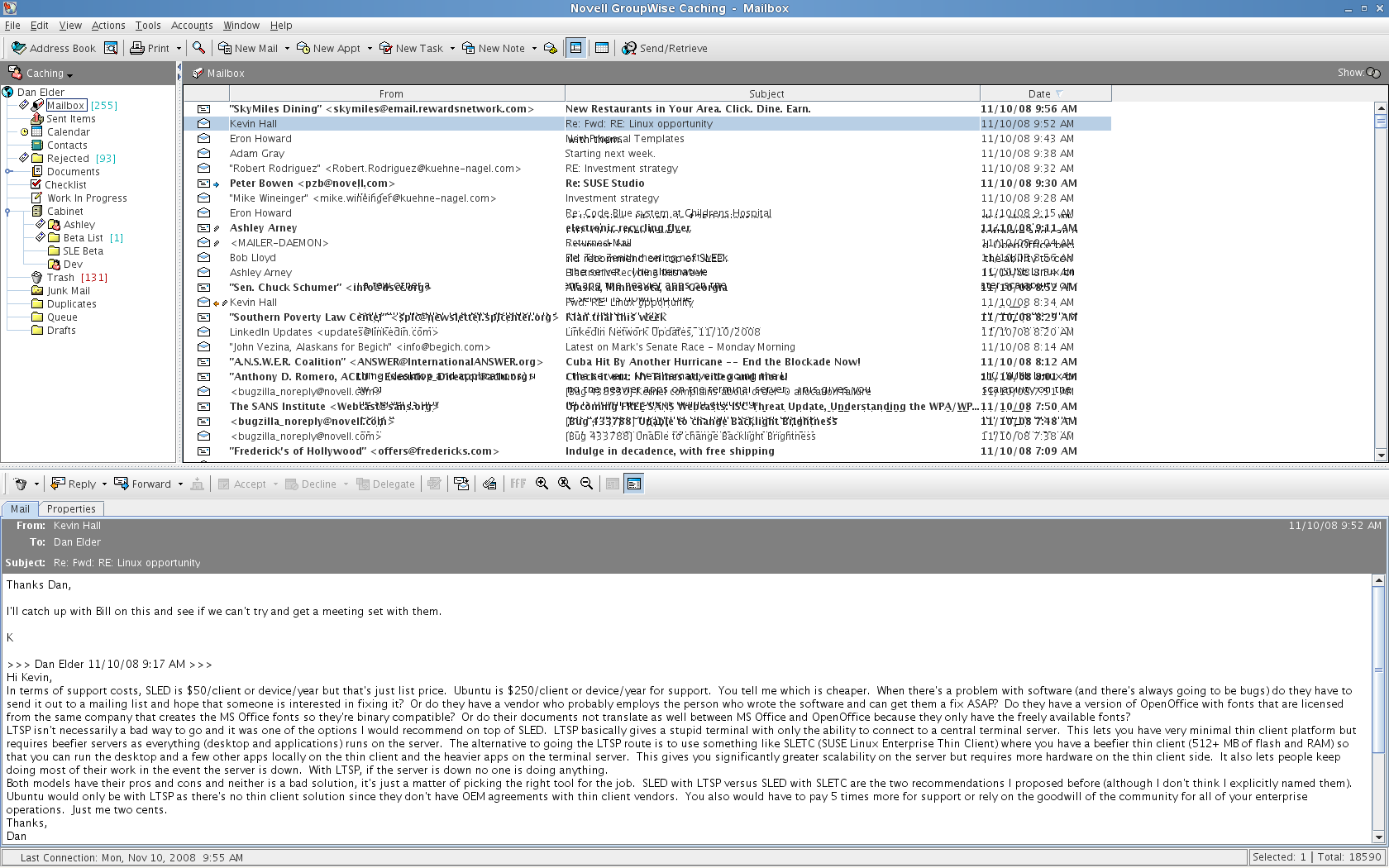 I'm running the latest OpenSUSE 11.1 beta (SLED 11 beta really) and have to face a cruel choice between very poor window drawing performance with EXA (https://bugzilla.novell.com/show_bug.cgi?id=438266) or having the Xserver crash during resume with Xaa (https://bugzilla.novell.com/show_bug.cgi?id=439214). I have a Lenovo T61 with an Intel 965 GM card that can either suspend properly but have lousy performance (EXA) or good window drawing but not be able to resume without killing X (XAA). Since EXA appears to be the way going forward I would think the best course of action is fixing the Window drawing performance problems of EXA. With EXA enabled it feels like I'm on a slow terminal server and WINE applications in particular take forever to render. Just let me know what information I can provide.