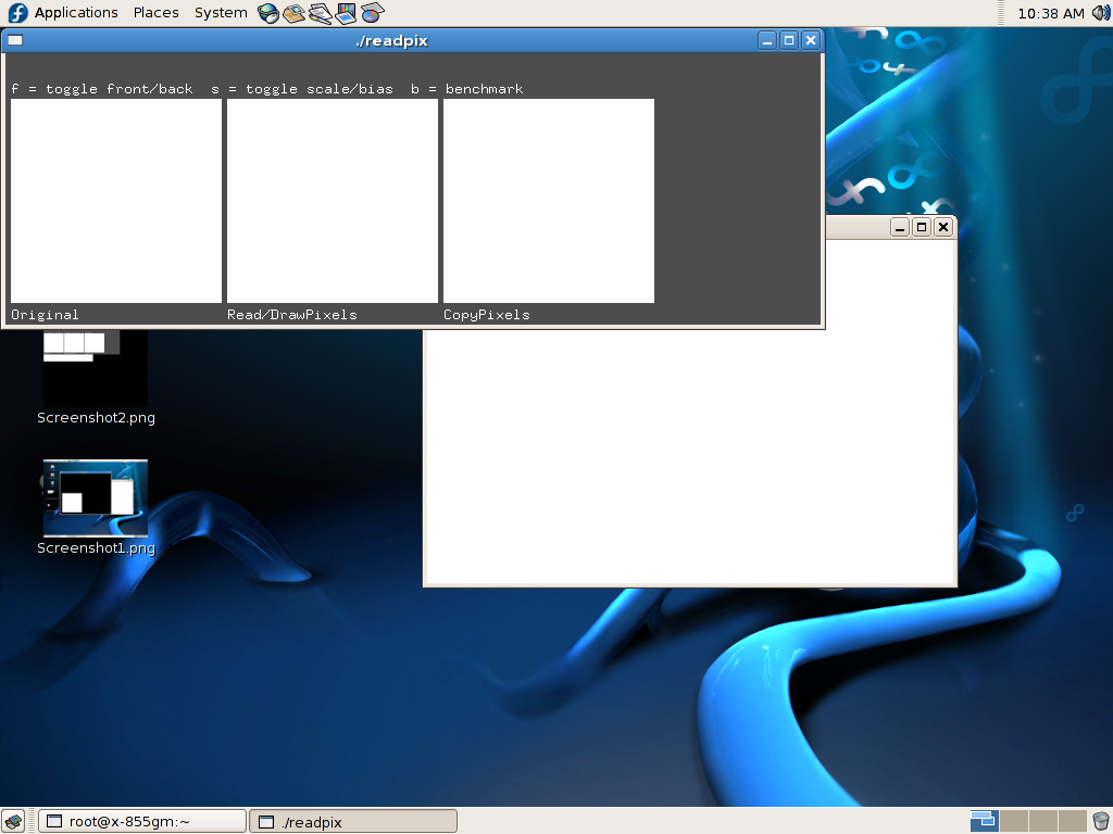 Created attachment 20782 [details] screenshot of drawpix System Environment: -------------------------- Host: x-855gm Arch: i386 OSD: Fedora Core release 6 (Zod) GEM_kernel: (for-airlied)728ced8c47f99a2287cdd0d3e77f5ae1a3d410e6 Libdrm: (master)b0d93c74d884b40bd94469a5ef75fdb2fef17680 Mesa: (master)154a9e5317f890618932cea0129ef887e16baf84 Xorg: 7.2 Xserver_stable: (server-1.6-branch)b268458eab2f213ec14dfe8013aa714c187e3aab Xf86_video_intel: (master)07f5a8223187c1abc79c104d2fa5859a54cecd30 Bug detailed description: ------------------------- startx ,run mesa demos drawpix and readpix , we will get nothing but a white window, see the screenshots in the attachment.