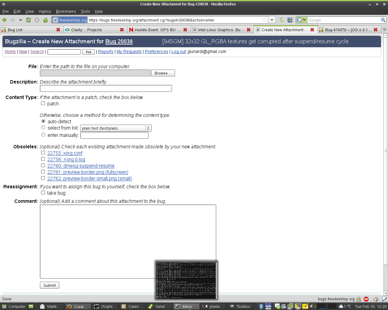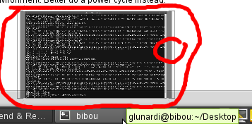 It would appear that on my system, small 32x32 GL_RGBA textures used for borders around window previews get corrupted after a suspend/resume cycle > /sbin/lspci | grep VGA 00:02.0 VGA compatible controller: Intel Corporation Mobile 945GM/GMS, 943/940GML Express Integrated Graphics Controller (rev 03) > uname -a Linux bibou 2.6.27.8-1-pae #1 SMP 2008-12-08 03:55:28 +0100 i686 i686 i386 GNU/Linux > glxinfo name of display: :0.0 display: :0 screen: 0 direct rendering: Yes server glx vendor string: SGI server glx version string: 1.2 [...] client glx vendor string: SGI client glx version string: 1.4 [...] OpenGL vendor string: Tungsten Graphics, Inc OpenGL renderer string: Mesa DRI Intel(R) 945GM 20080716 x86/MMX/SSE2 OpenGL version string: 1.4 Mesa 7.2 [...] glu version: 1.3 [...] > cat /etc/SuSE-release SUSE Linux Enterprise Desktop 11 (i586) VERSION = 11 PATCHLEVEL = 0 Reproducible: 100% 1) enable that compiz is running and windows preview plug-in is enabled 2) ensure window previews show up when mouse over window list applet 3) suspend to RAM 4) resume from suspend 5) mouse over the window list applet 6) you will notice the border and shadows are not properly rendered Tried to follow the instructions here http://intellinuxgraphics.org/how_to_report_bug.html and will attached the suggested documents.