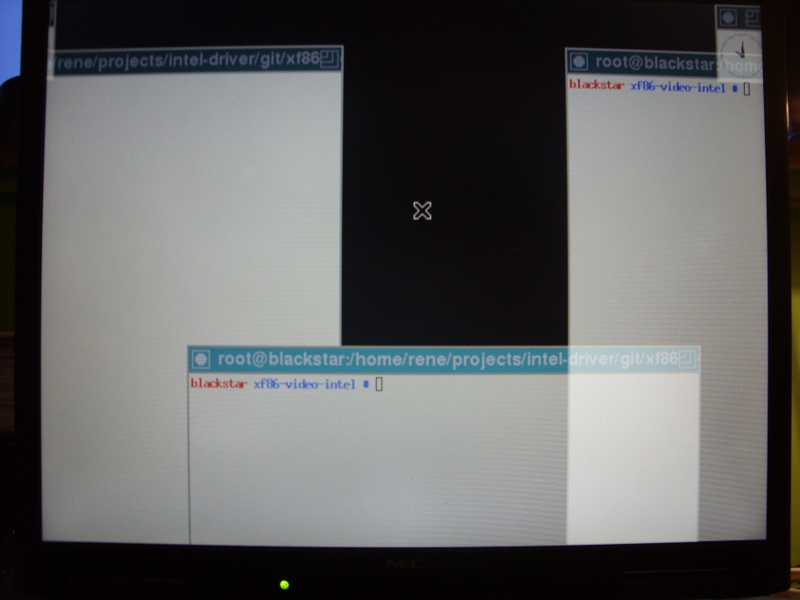 Hi, I think I'm having exactly the same issues, when using UXA acceleration, without KMS. Using KMS is not possible, since it produces just a black screen (bug#20115 ). The UXA issue is present for kernel versions 2.6.29 and 2.6.30. And a gentoo system configuration: - xorg-server-1.5.3-r6 and xorg-server-1.6.1.901-r3 - xf86-video-intel-2.7.1 - mesa-7.4.2 - libdrm-2.4.11 - libpciaccess-0.10.6 The above line fixed the issue for me, using kernel 2.6.30 and xorg-server-1.6.1.901-r3. I haven't tested the other three configurations.