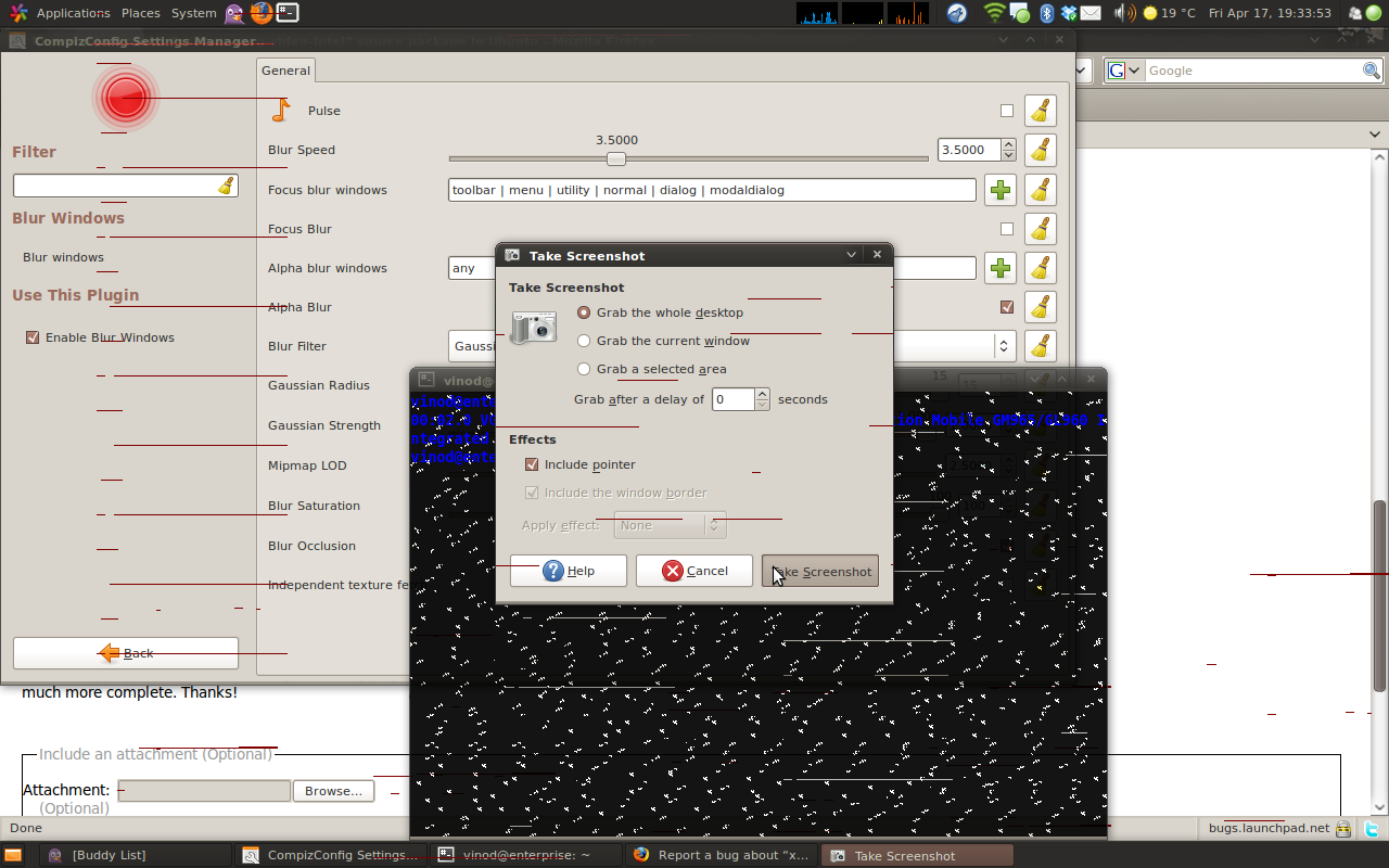 Forwarding this bug from a ubuntu reporter: https://bugs.edge.launchpad.net/ubuntu/+source/xserver-xorg-video-intel/+bug/363174 * See also [Problem] Compiz works like a charm until the blur plugin is enabled. Enabling blur causes X to slow down drastically. Screen garbage is seen on minimize and restoring a window. "Good" behaviour is restored by disabling the blur plugin and restarting X. This is with UXA enabled. Tested: -intel 2:2.6.3-0ubuntu9 -intel 2:2.7.0-1ubuntu1~xup~1 compiz 1:0.8.2-0ubuntu8.1 [lspci] 00:02.0 VGA compatible controller [0300]: Intel Corporation Mobile GM965/GL960 Integrated Graphics Controller [8086:2a02] (rev 0c)
