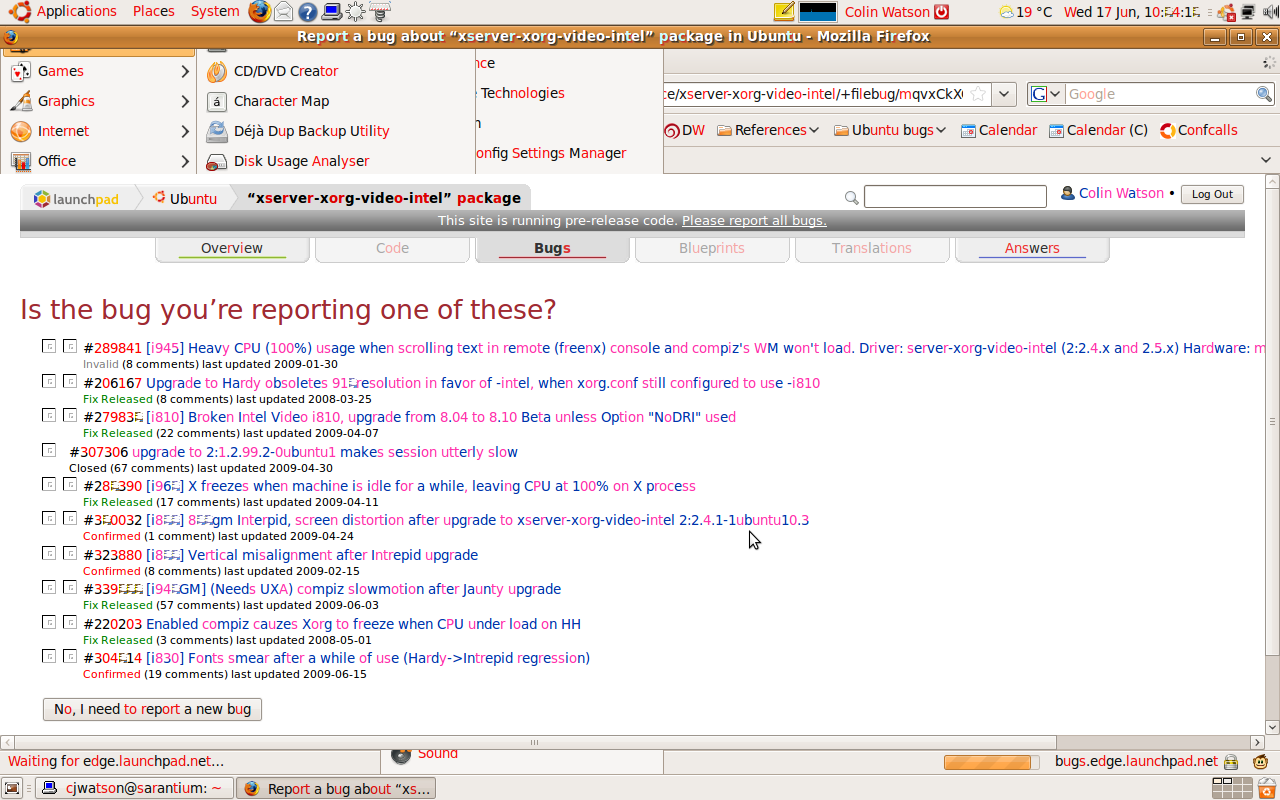 Created attachment 26934 [details] Screenshot.png Forwarding this Ubuntu bug report: https://bugs.edge.launchpad.net/ubuntu/+source/xserver-xorg-video-intel/+bug/388368 [Problem] Poor performance experienced with text scrolling and text typing when using 2.7.99.x, along with incorrectly colored letters. Issue goes away downgrading to 2.7.1. [lspci] 00:00.0 Host bridge [0600]: Intel Corporation Mobile PM965/GM965/GL960 Memory Controller Hub [8086:2a00] (rev 0c) Subsystem: Dell Device [1028:01fe] 00:02.0 VGA compatible controller [0300]: Intel Corporation Mobile GM965/GL960 Integrated Graphics Controller [8086:2a02] (rev 0c) Subsystem: Dell Device [1028:01fe] [RelatedPackageVersions] xserver-xorg 1:7.4~5ubuntu21 libgl1-mesa-glx 7.4.1-1ubuntu2 libdrm2 2.4.11-0ubuntu1 xserver-xorg-video-intel 2:2.7.99.1+git20090602.ec2fde7c-0ubuntu2 xserver-xorg-video-ati 1:6.12.2-2ubuntu1 [System] Architecture: i386 Date: Wed Jun 17 10:47:29 2009 DistroRelease: Ubuntu 9.10 MachineType: Dell Inc. Latitude D830 ProcCmdLine: BOOT_IMAGE=/boot/vmlinuz-2.6.30-9-generic root=UUID=6df978ed-c024-49d7-9157-bdd7bd05153d ro quiet splash distro: Ubuntu architecture: i686kernel: 2.6.30-9-generic dmi.bios.date: 06/07/2007 dmi.bios.vendor: Dell Inc. dmi.bios.version: A02 dmi.board.name: 0HN341 dmi.board.vendor: Dell Inc. dmi.chassis.type: 8 dmi.chassis.vendor: Dell Inc. dmi.modalias: dmi:bvnDellInc.:bvrA02:bd06/07/2007:svnDellInc.:pnLatitudeD830:pvr:rvnDellInc.:rn0HN341:rvr:cvnDellInc.:ct8:cvr: dmi.product.name: Latitude D830 dmi.sys.vendor: Dell Inc. [Original Report] Versions of the Intel driver later than 2:2.7.1-1ubuntu1 are unusably slow for me. The first thing I do after starting X is normally to start a pterm and maximise it; the first sign of trouble is that the scrollbar takes ages to be replaced by normal black terminal area on maximisation. After that, Xorg is using nearly 100% CPU, text scrolling is very slow, etc. Typing this report is excruciatingly painful because it can take up to a second for each character to appear, especially when the typeahead buffer gets at all full. EXA vs. UXA makes no obvious difference. There are some rather odd visual effects as well: lots of letters are the wrong colour. This may have only started after switching VT away from X and back; I'm not quite sure. Bizarrely, this is visible in a screenshot (I'm not using compiz or anything fancy like that), which I'll attach to this bug. Downgrading to 2:2.7.1-1ubuntu1 puts everything back to normal.