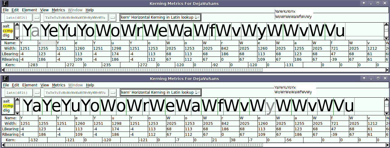 more kerning adjustments. New pairs include the following: YaYeYuYoYx WoWrWeWa Vu Screenshots before and after the adjustments are attached below.