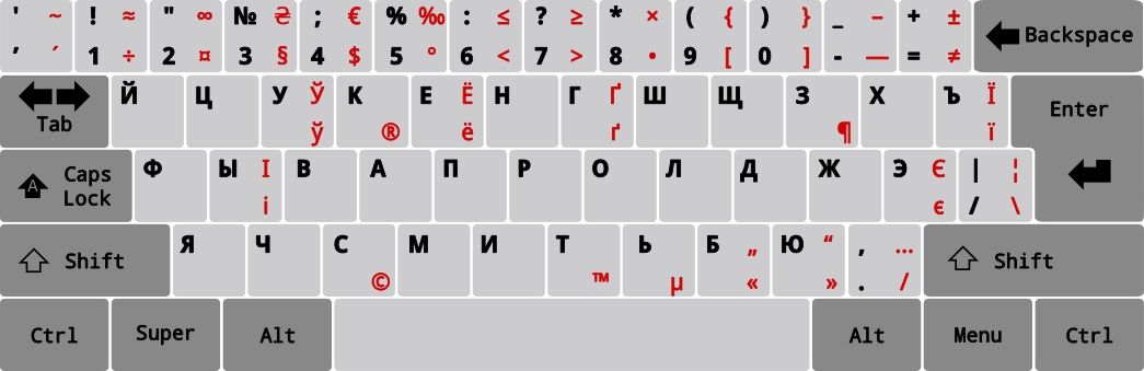 Created attachment 39230 [details] Схема Украинской unicode раскладки Русско-украинская совмещённая раскладка. По моим наблюдениям, наиболее распространённый набор раскладок украинца состоит из английской (EN), русской (RU) и украинской (UA) в разных последовательностях. Также заметил, что мало кто из обладателей такого набора пользуется RU и UA в равной степени — в большинстве случаев одна из них является основной (работа с основной документацией, деловая переписка, бухгалтерия и т. д.), а другая применяется лишь в редких случаях (некоторые поисковые запросы, регламентированные документы, отчёты и т. д.). Зачем постоянно держать раскладку, которая нужна не всегда да и отличается от основной лишь несколькими символами? А незачем — можно перенести эти самые символы на третий уровень в основную раскладку! В нашем случае (RU и UA) такой велосипед уже есть — Украинская unicode раскладка. Это UA раскладка с отличающимися русскими буквами в третьем уровне. А вот для тех, у кого основная раскладка — RU (к числу которых отношусь и я) решение отсутствует. Давайте восполним этот пробел. Предлагаю вашему вниманию «зеркальный» вариант Украинской unicode раскладки с небольшими изменениями («Ґ» переехала - м.п. в «незеркальной» раскладке тоже не мешало бы поместить «Ґ» туда же, а не на «гуляющую» от модели к модели <BKSL>) — вложение RU-UA_unicode_Layout.png. Присутствие в раскладке белорусского краткого «у» (Ўў) — делает её интересной и для носителей этого языка. Осталось решить куда политкорректней поместить эту вариацию: в Русскую или Украинскую раскладку (а может и в Белорусскую или во все). Я прилагаю два варианта — ua и ru. (RU-UA_unicode_Layout.tar) Также прилагаю RU-UA_unicode_Layout.svgz — это раскладка клавиатуры в векторном формате (может кому пригодиться как шаблон для собственной раскладки).