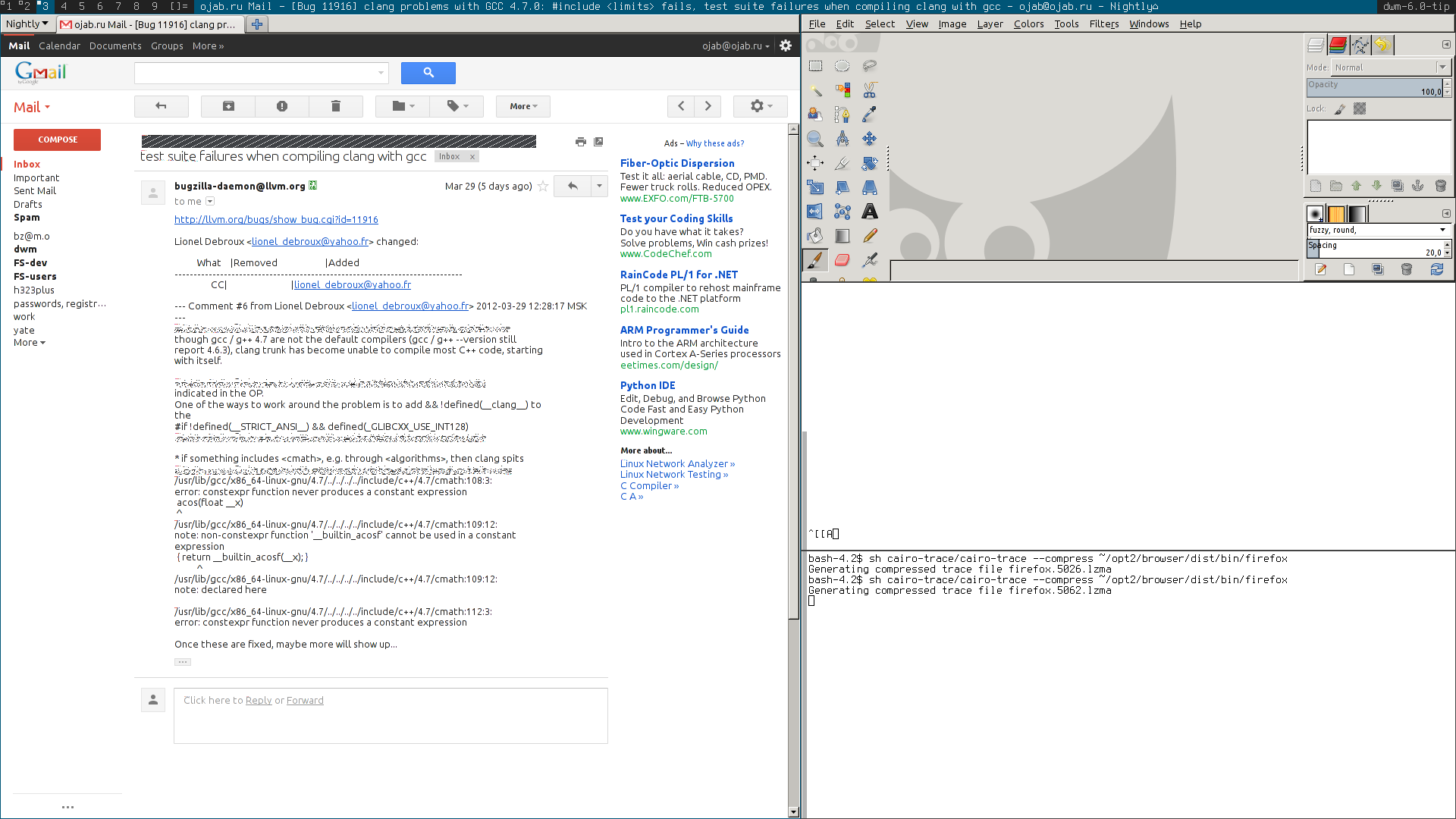 Created attachment 59429 [details] cairo trace `cairo-trace firefox` with gmail loading, font corruption was in the mail body. xorg-server-1.12.0 with exa-composite-region.diff xf86-video-ati-6.14.4 libdrm-2.4.33 OpenGL renderer string: Gallium 0.4 on AMD RS780 OpenGL version string: 2.1 Mesa 8.1-devel (git-ead0a89) OpenGL shading language version string: 1.20 cairo latest git (HEAD is now at cc247c3 gl: Remove an unused variable) build with --enable-tee --enable-xlib-xcb