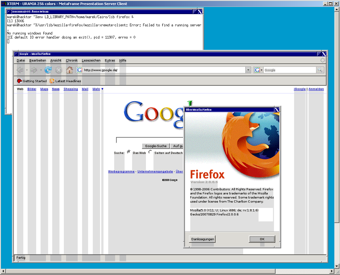 I stumbled across a similar problem: Firefox wouldn't start on a 256-color Citrix Metaframe (aka ICA) display (commercial software to display X on a Windows PC). So I took cairo-1.4.12, applied the most recent of the attached patches, compiled my own libcairo, and started firefox 2.0.0.6 with LD_LIBRARY_PATH set to the new libcairo, which resulted in this error message: Error: Cairo 1.4.12 does not yet support the requested image format: Depth: 8 Alpha mask: 0x00000000 Red mask: 0x00000000 Green mask: 0x00000000 Blue mask: 0x00000000 Please file an enhancement request (quoting the above) at: http://bugs.freedesktop.org/enter_bug.cgi?product=cairo firefox-bin: cairo-image-surface.c:199: _cairo_format_from_pixman_format: Assertion `NOT_REACHED' failed. I tried changing line 173 of src/cairo-image-surface.c to: case 8: if ((am == 0xff || am == 0x0) && But that did not help - firefox then crashes with a segfault. Could be that the version jump of libcairo.so.2.9.2 to libcairo.so.2.11.6 was too high, and I'd have to recompile all GTK/firefox, which I cannot afford. I will try patching the older release of cairo (1.2.4), and let you know...