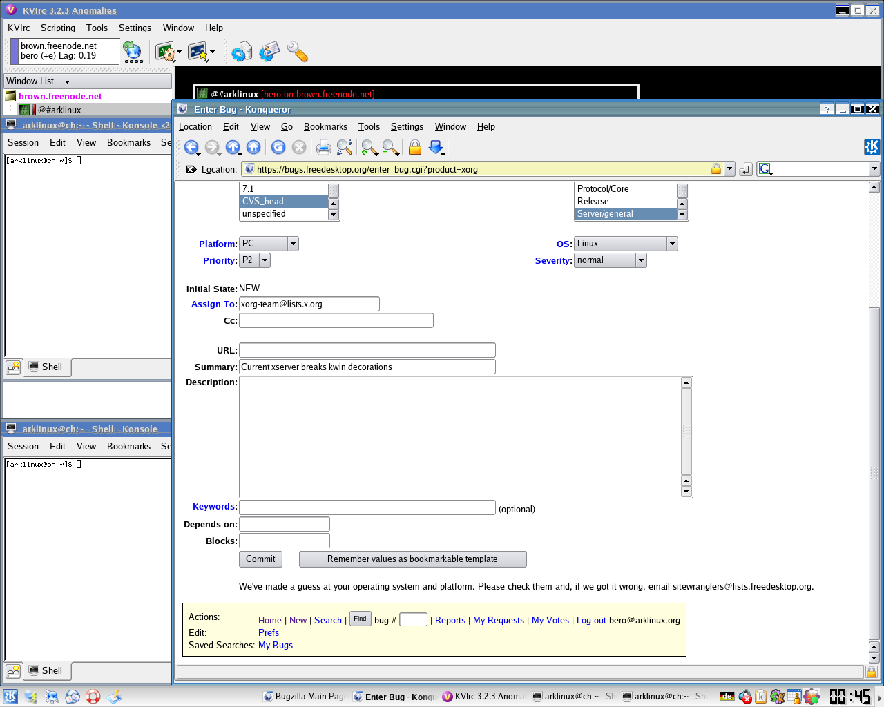 Updating xorg-server to 1.1.99.2 or current git breaks kwin's window decorations (the default Plastik style). 1.1.0 works perfectly; didn't update anything other than xorg-server, so it's not a driver thing.