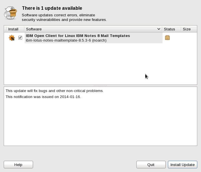 Created attachment 92509 [details] [review] attachment-14151-0.html Hi Richard It's only when I try to install this update (screen dump) I get the error. Med venlig hilsen/Best regards Lars Møller Nielsen ____________________________________________ IT Specialist - Security IBM Denmark ApS Olof Palmes Allé 44, DK-8200 Århus N. Mobile: +45-41203824 e-mail: lmn@dk.ibm.com From: bugzilla-daemon@freedesktop.org To: Lars Moller Nielsen/Denmark/IBM@IBMDK, Date: 21.01.2014 10:18 Subject: [Bug 73867] Update of Linux failed Comment # 3 on bug 73867 from Richard Hughes Do you get the same error if you disable the ibm-check-lotus-updates plugin? You are receiving this mail because: You reported the bug. Medmindre andet er angivet ovenfor: / Unless Otherwise Stated Above: IBM Danmark ApS Nymøllevej 91 2800 Kongens Lyngby, Danmark CVR nr.: 65305216