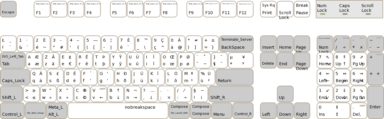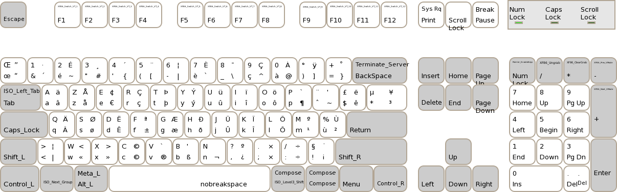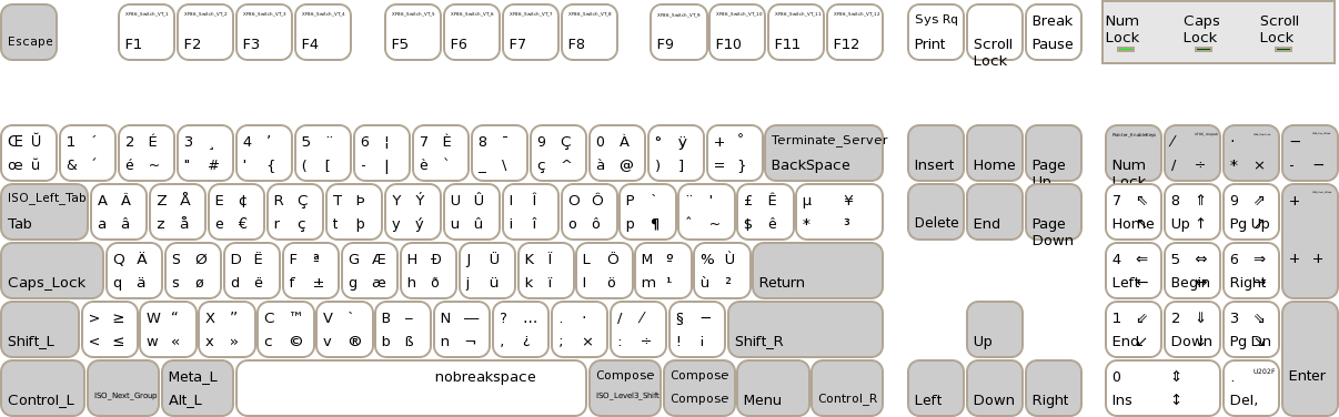 FOUR_LEVEL_KEYPAD could be modified like this: 1. If you don`t press shift nor AltGr (right alt), the behaviour is the same as the standard keypad with Server Control 2. Pressing shift and/or AltGr ignores NumLock and yields extra symbols. (I`m not smart enough to program these patches, so I`m just writing what should be in '/usr/share/X11/xkb/types/extra' file) 1. Si l`on ne touche ni shift ni AltGr (Alt droite), le clavier agit comme s`il était ordinaire (Server Contol inclus) 2. Si l`on touche shift où AltGr, des symboles supplémentaires seront genérés avec n`importe quel état de NumLock. (voici le contenu desiré du fichier '/usr/share/X11/xkb/types/extra') partial default xkb_types "default" { type "SIX_LEVEL_KEYPAD" { modifiers = Shift+NumLock+LevelThree+Control+Alt; map[None] = Level1; map[Shift] = Level3; map[NumLock] = Level2; map[Shift+NumLock] = Level3; map[LevelThree] = Level4; map[Shift+LevelThree] = Level5; map[NumLock+LevelThree] = Level4; map[Shift+NumLock+LevelThree] = Level5; map[Control+Alt] = Level6; level_name[Level1] = "Base"; level_name[Level2] = "Number"; level_name[Level3] = "Shift"; level_name[Level4] = "AltGr "; level_name[Level5] = "Shift AltGr"; level_name[Level6] = "Ctrl+Alt"; }; }; --------------- should it be possible to press shift+KP_Left for some programs to mark a region of text? If so, I could change the level assignment such that the keypad ignores any modifier (except for Ctrl+Alt) when NumLock is off. '../symbols/pc' could look like this: Est-ce qu`on a besoin de la possibilité de toucher shift+KP_Left afin de permettre aux logiciels de marquer une region de texte? Moi, je pourrais modifier ce propos de sorte qu`on ne puisse générer des symboles supplémentaires qu`avec NumLock active. Voici une possibilité de modifier le fichier '../symbols/pc': key.type[Group1]="SIX_LEVEL_KEYPAD"; %modifiers to be pressed / modificateurs à toucher: % (-) NumLock Shift AltGr Shift+AltGr Ctrl+Alt key <KPDV> {[division,division,colon, U2298,KP_Divide, XF86_Ungrab]}; key <KP9> {[KP_Prior,KP_9, noSymbol,U2168,U2468, noSymbol]}; This is not a desired key mapping, it only shows how to do it! Ceux ne sont pas les symboles desirés, il s`agit du savoir-faire. I could also include the modifiers rightControl and the Windows key if desired. Je pourrais aussi introduire les modificateurs «Contrôle, selection de groupe» et la touche fenêtre si l`on en ait besoin. Gruß, Fabian.