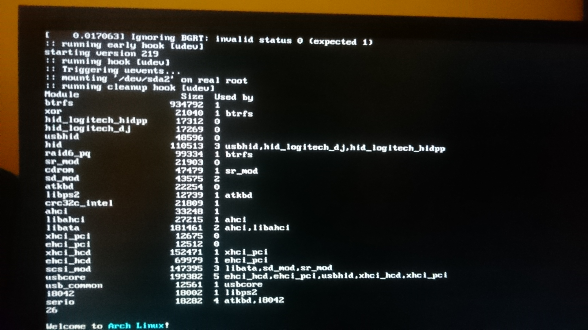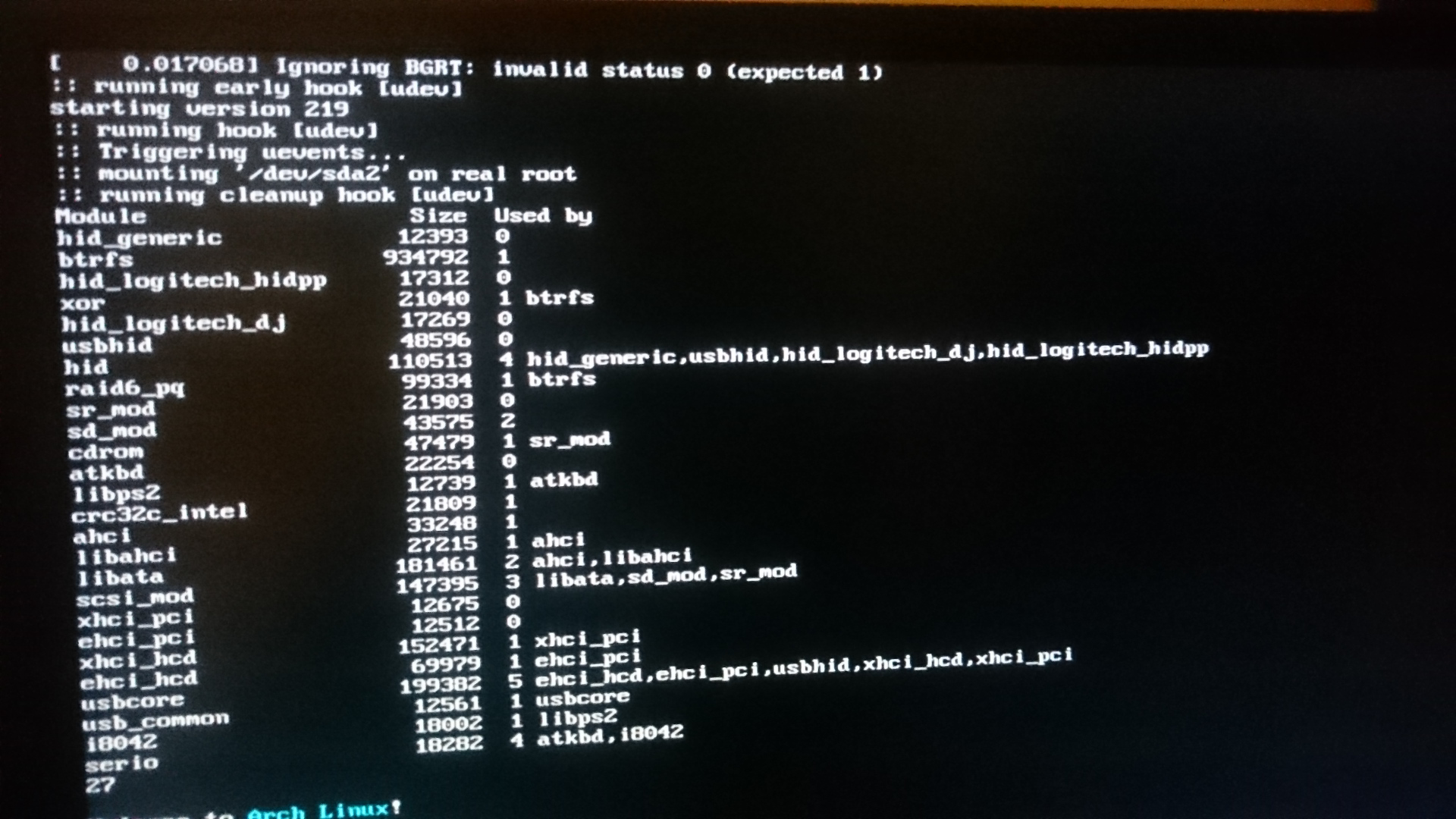 Created attachment 115307 [details] modified "hook" script for reproducing issue So i add `lsmod` and `lsmod | wc -l` after the "early" udevd is exited to see the (number of) modules get loaded, and by toggling `sleep 1` you can see they change despite the `udevadm settle` command. Four screenshots from two test cases will follow. The two cases aim to show that it's not a module-specific problem. The difference of the two cases is the port being used by my two usb hid receivers: In case 1 Receiver A use Port 13 and Receiver B use Port 14; In case 2 Receiver A use port 14 and Receiver B use Port 13.