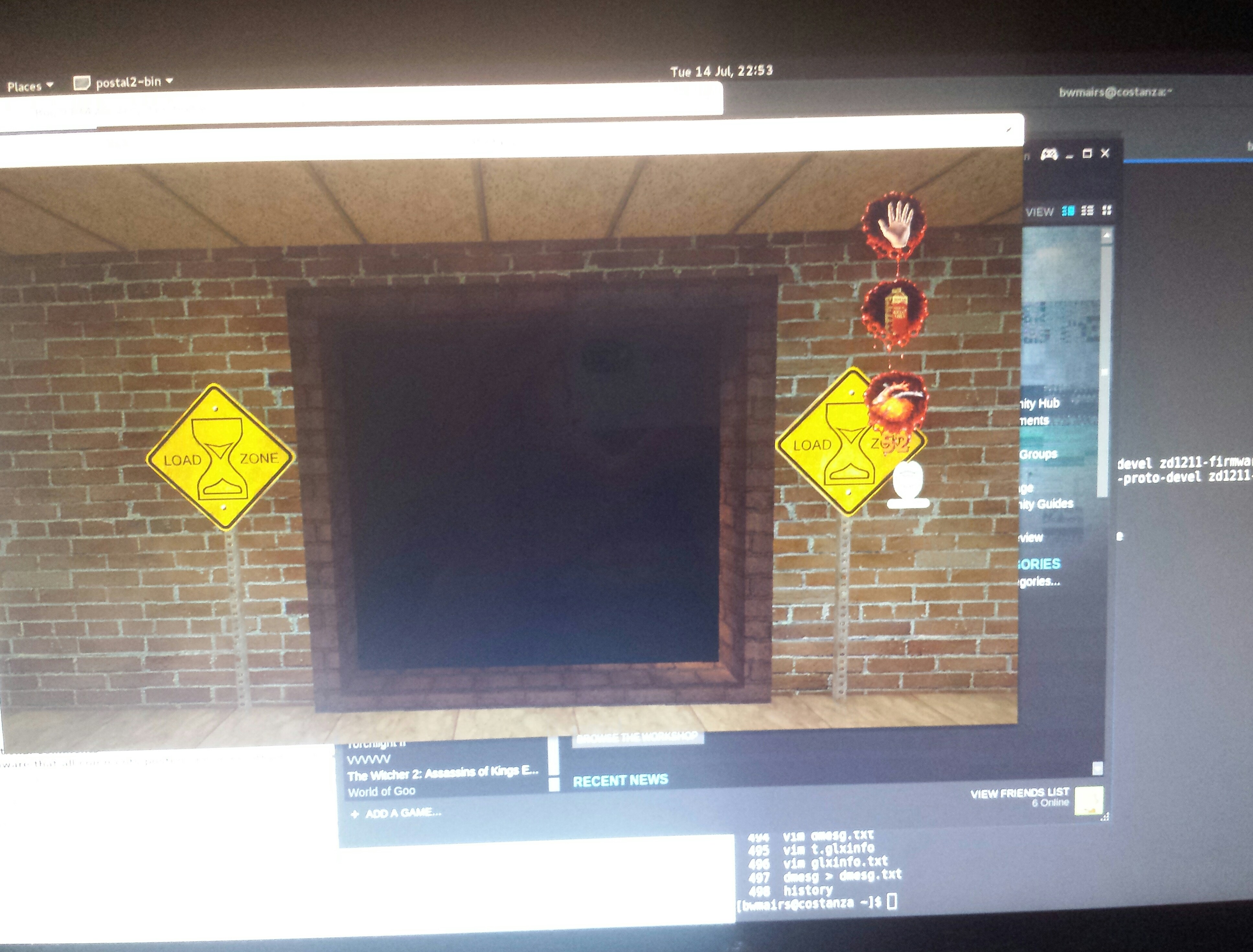 I'd like to take a screenshot, but Postal 2 likes to take over my desktop and I'm not certain how to rectify this. I can't alt-tab out of Postal 2 to take a screenshot and using Steam's screenshot utility, I only get garbled output. but on radeonsi on Cape Verde hardware (git-8787141) some models (mostly NPCs and doors) have VERY dark lighting, almost black. For the doors it is always the entire door that is dark, but it then sometimes is properly lit when I walk close enough to the door. For NPCs, they are sometimes properly lit below the waist and very dark above. I have an extra game in my Steam inventory and will be happy to send it to someone to help debug this.