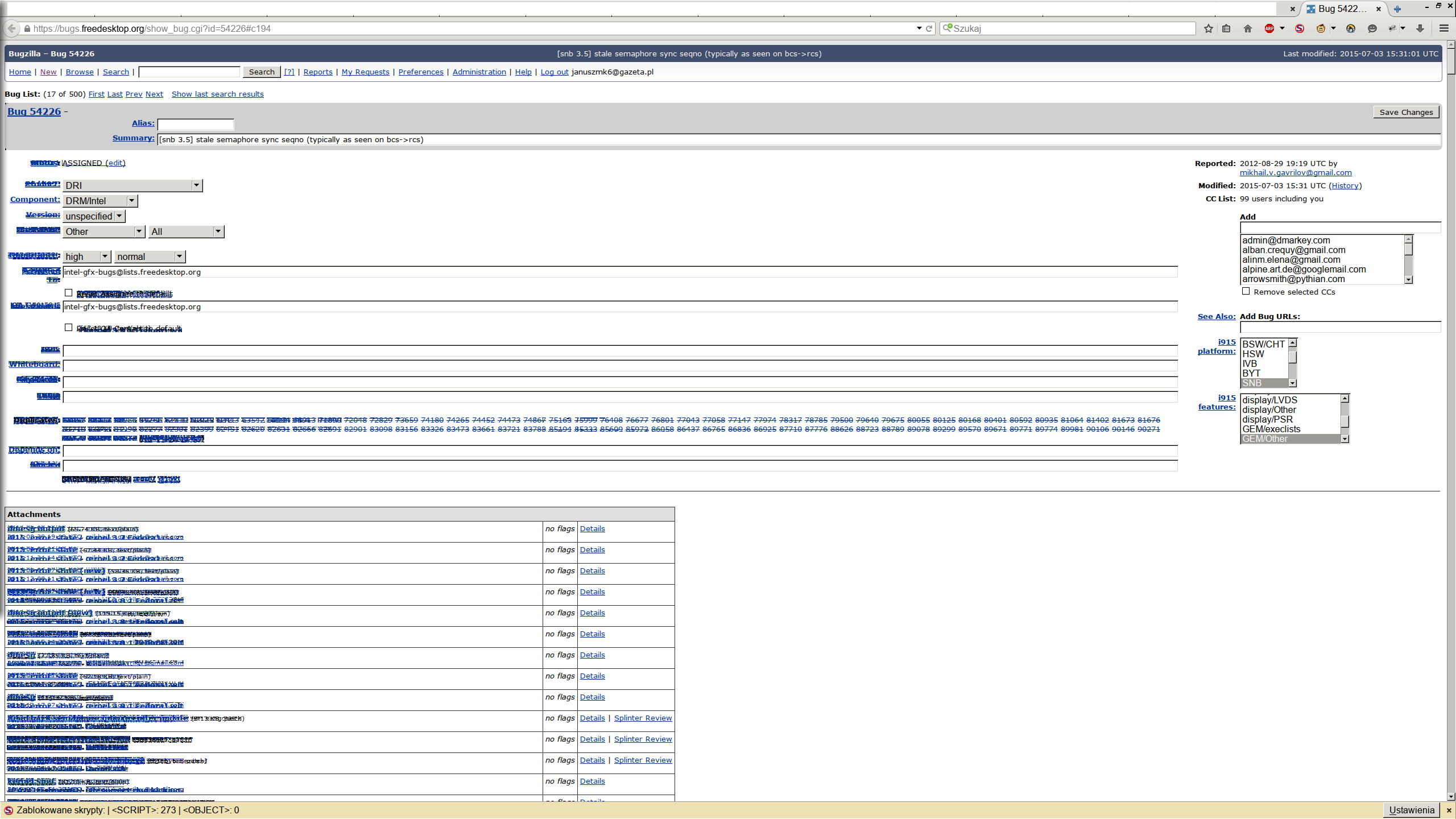 I have new CPU i7 6700k, and I am using now integrated GPU in CPU, Intel® HD Graphics 530. In dmesg I noticed I get lot of dumps (see attachments). I am running now kernel 4.2.0-rc5 (running with options intel_iommu=on i915.preliminary_hw_support=1), xf86-video-intel 2.99.917 on gentoo, xorg-server-1.17.2 and mesa-10.6.3. I have three monitors and using i3wm with compton. I also have some problems with rendering, see screenshoot in attachment.