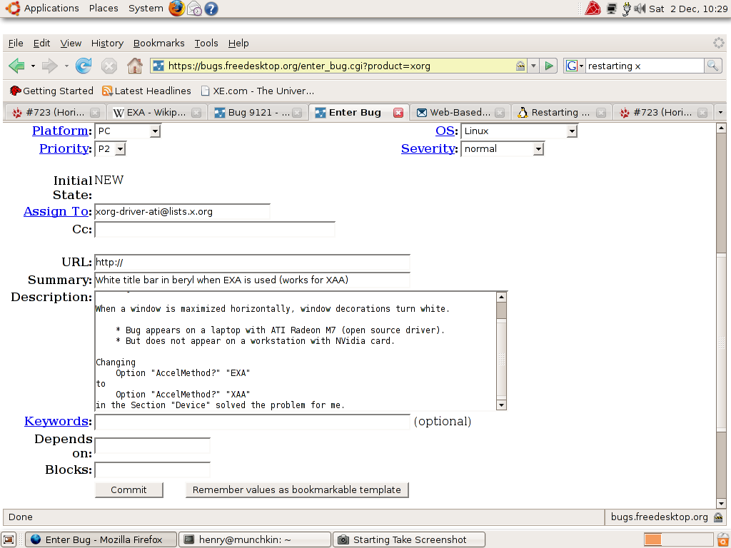 (copied from cache of the beryl bug. Apologies if this is the wrong place to report the bug.) When a window is maximized horizontally, window decorations turn white. * Bug appears on a laptop with ATI Radeon M7 (open source driver). * But does not appear on a workstation with NVidia card. Changing Option "AccelMethod?" "EXA" to Option "AccelMethod?" "XAA" in the Section "Device" solved the problem for me.