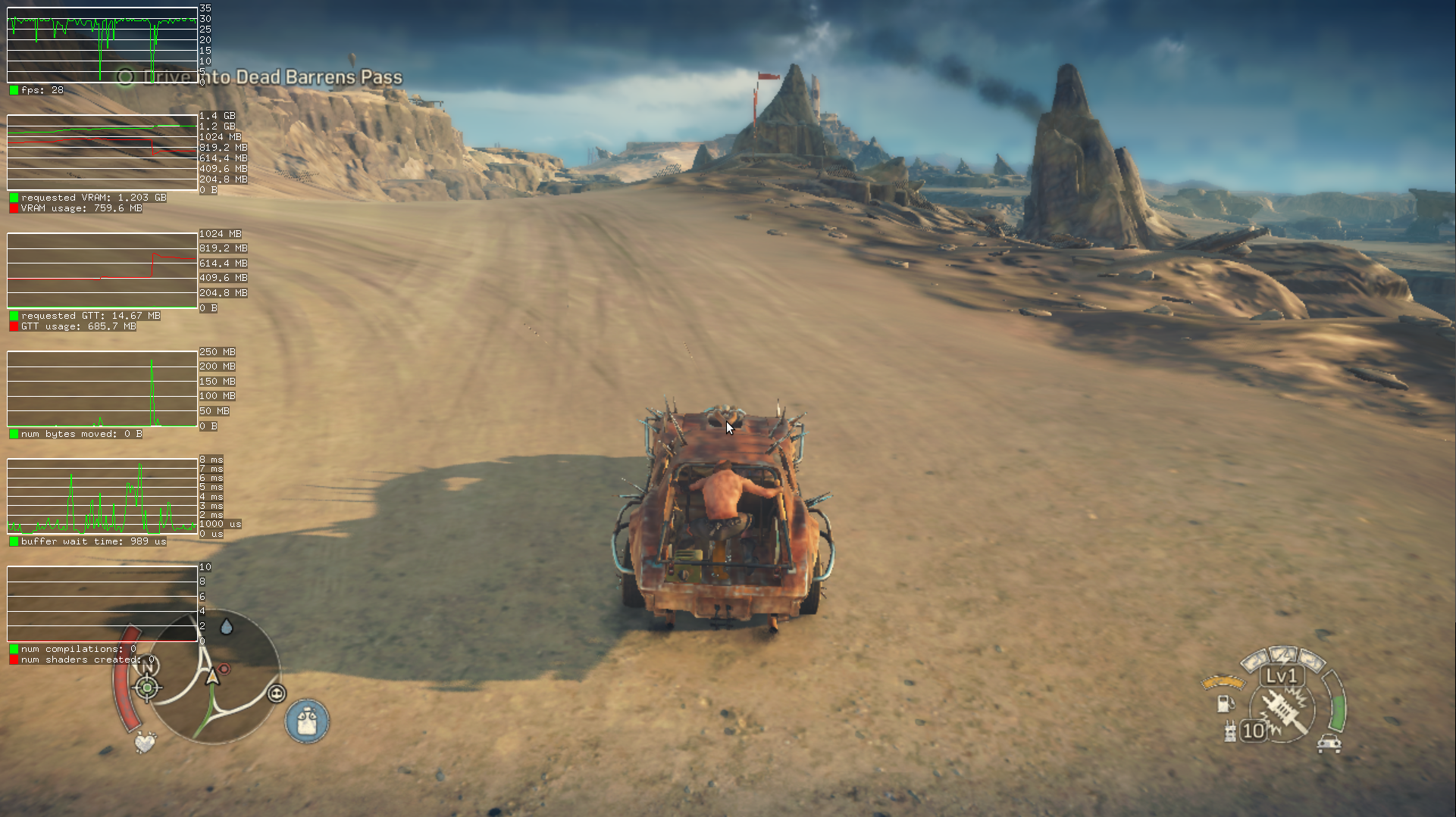 I get random lagging when playing the recently released Mad Max. Every once in a while, the game freezes completely, and gets back to the game after an arbitrary amount of seconds, anywhere from 2 to 35. With GALLIUM_HUD, and noticed that the lags appear to precede the VRAM slowly ramping up to full, and then I get this huge lag, and then VRAM usage is a lot lower (eg. from 1GB to ~600MB). I found this possibly related news item from a couple of months back: https://www.gamingonlinux.com/articles/a-reason-for-poor-performance-on-amd-plus-mesa-has-been-found-and-a-patch-is-in-progress.7873