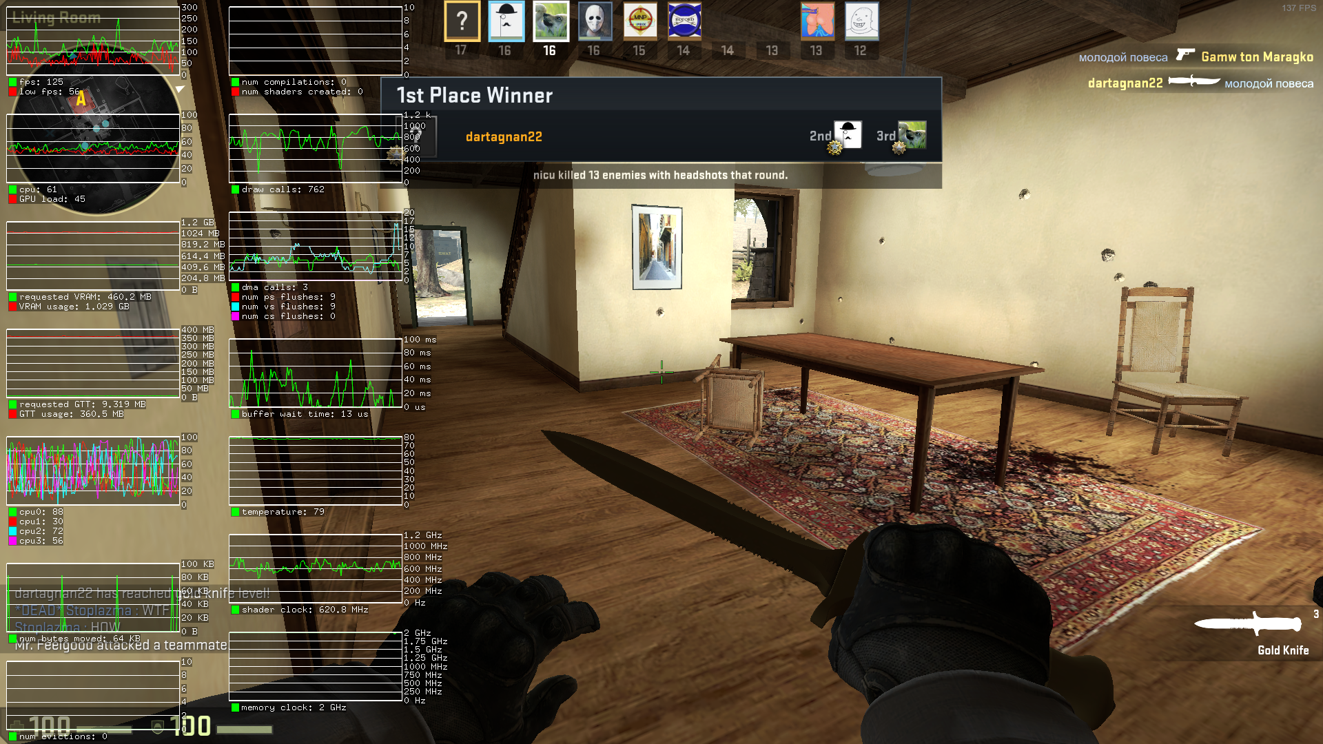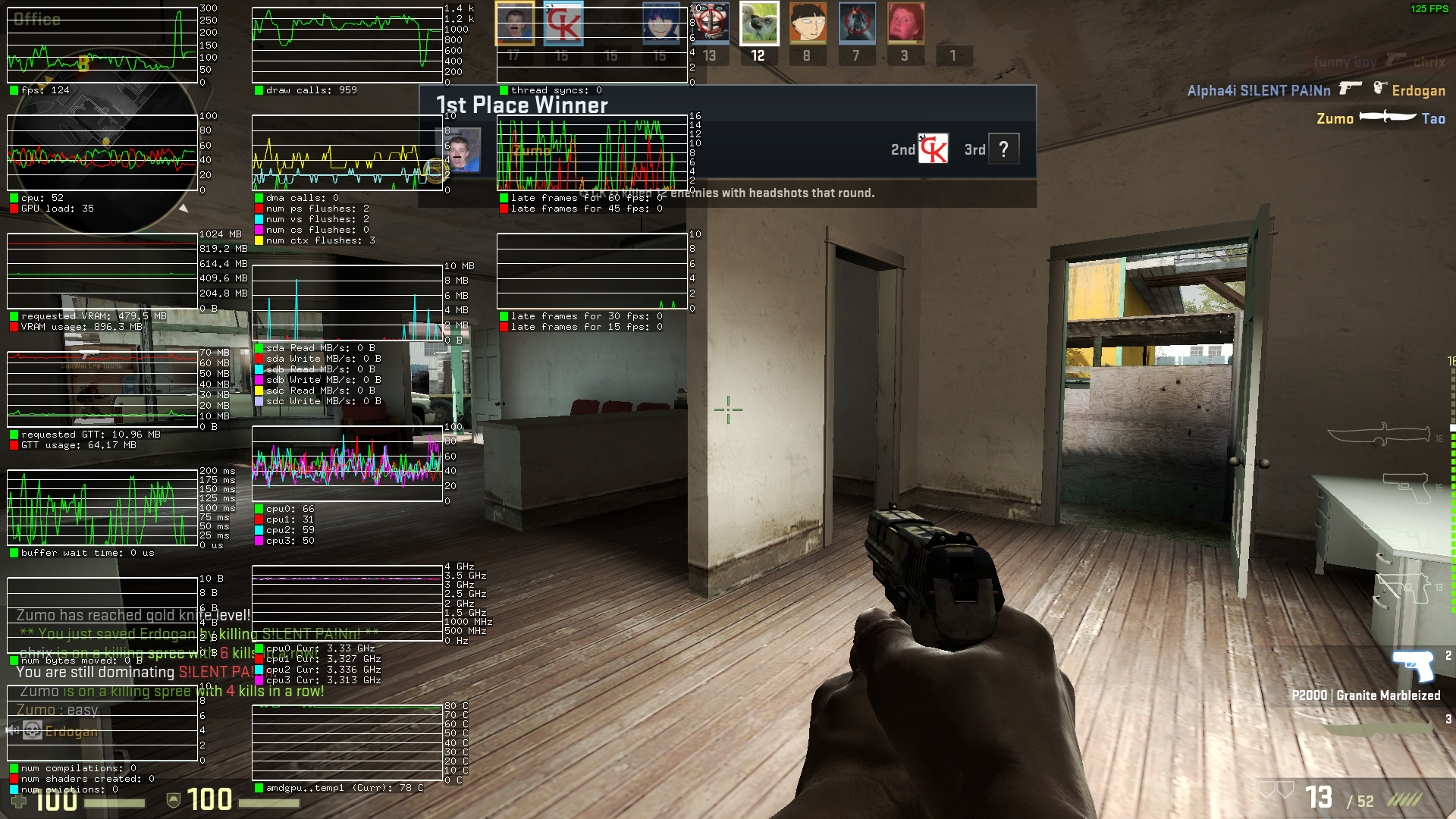 Created attachment 128345 [details] screenshot csgo gallium nine For comparison purposes, here is a screenshot of the windows version with gallium nine. Same hardware, same software. Note the high GPU load (It only has large drops when you die and it plays the "killcam" animation), higher CPU load and much smaller buffer wait times. Valve said lower performance is expected because of their shader translation with togl, but this seems extreme.